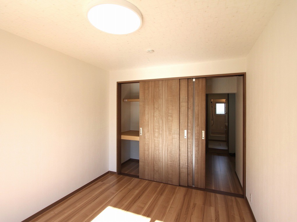 和室から洋室になった寝室。押入れの空間は残して、 襖と入り口ドアを3枚引き戸にしました。