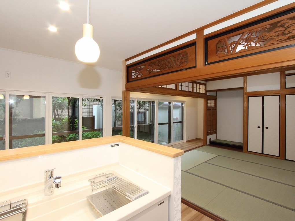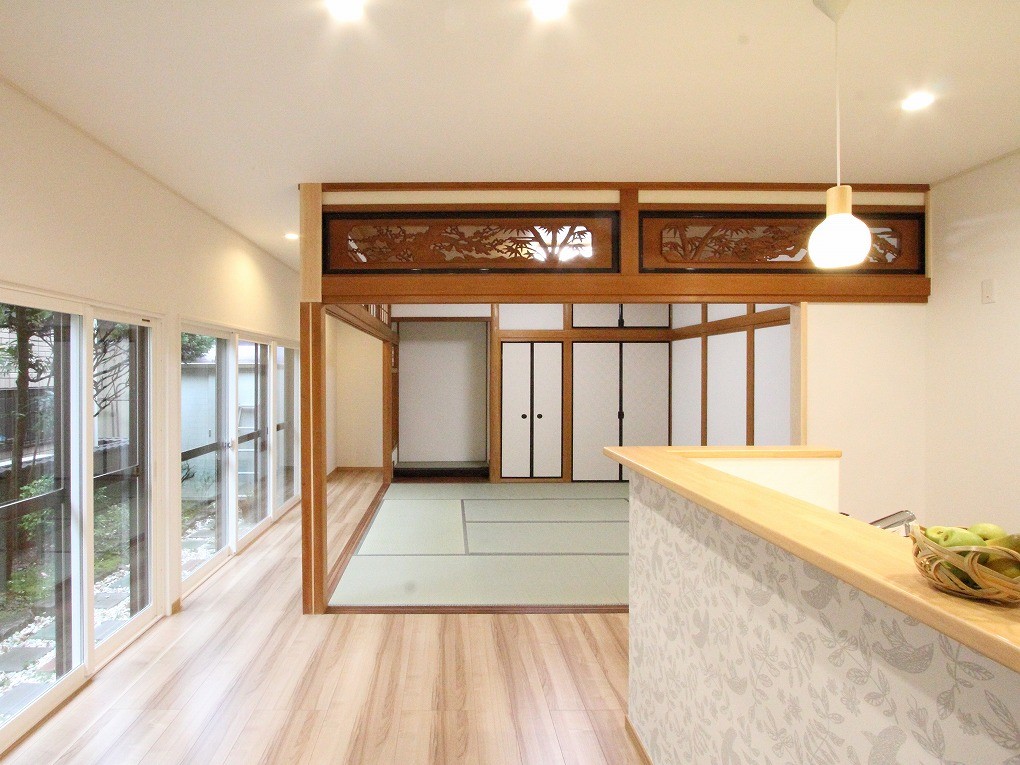 これまで北側のお部屋にあったダイニングキッチンを、南側の和室に移動して広々としたLDKに。大きな掃き出し窓から入りこむ明るい陽ざしが、賑やかな団らん時間を優しく包み込みます。和と洋のテイストを違和感なく取り込んだ、欄間がつなぐ新しいLDKができました。