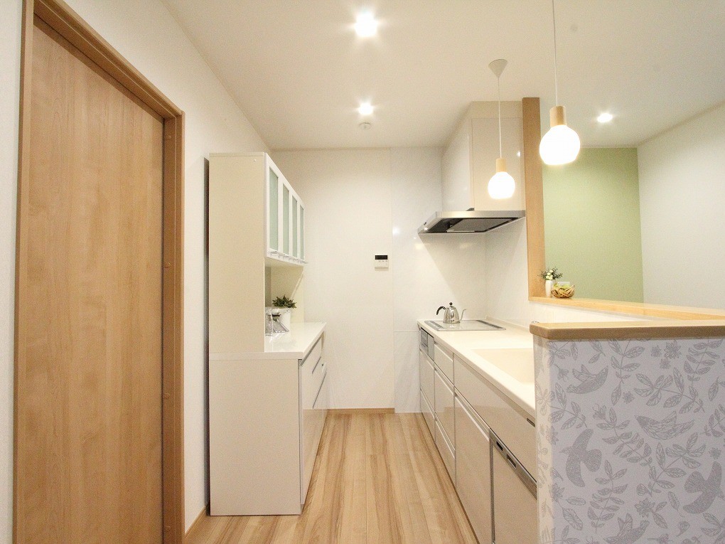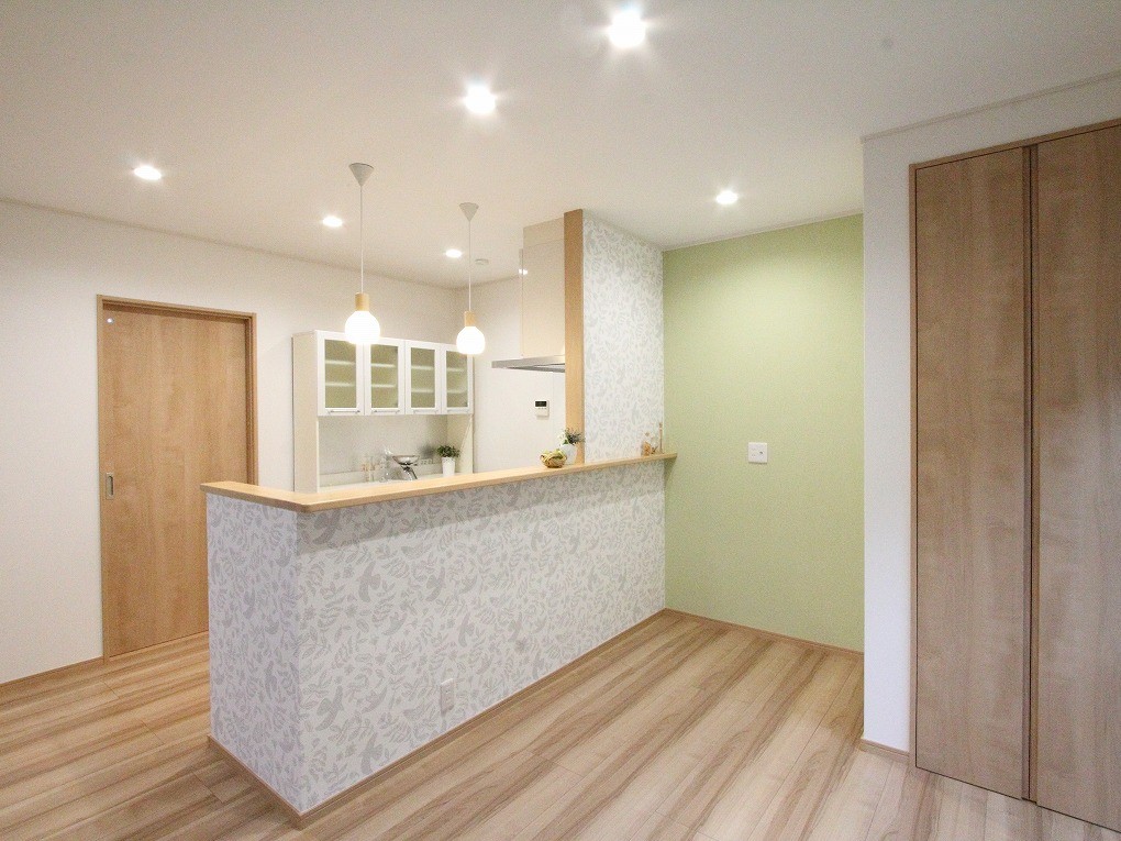 優しいグリーンのアクセントクロスと、カウンター周りに使用したナチュラルな柄のクロスが、ご家族の暖かな食事シーンを彩ります。