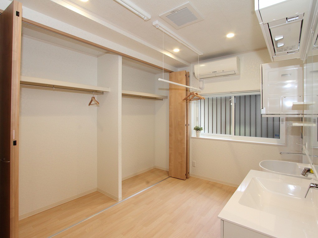 家事室には、洗面化粧台とスロップシンク、洗濯機、ガス乾燥機、ホスクリーンを設置。すぐ隣にはクローゼット。