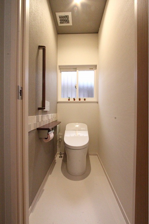 トイレ内部はシンプルながらも一面のみ壁紙の色を変え、帯状にタイルを張りアクセントにしました。