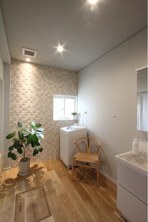 広々とした洗面・脱衣室には、一面にエコカラットを貼り、その面を照らすスポット照明にしたことで、まるでホテルのような空間になりました。