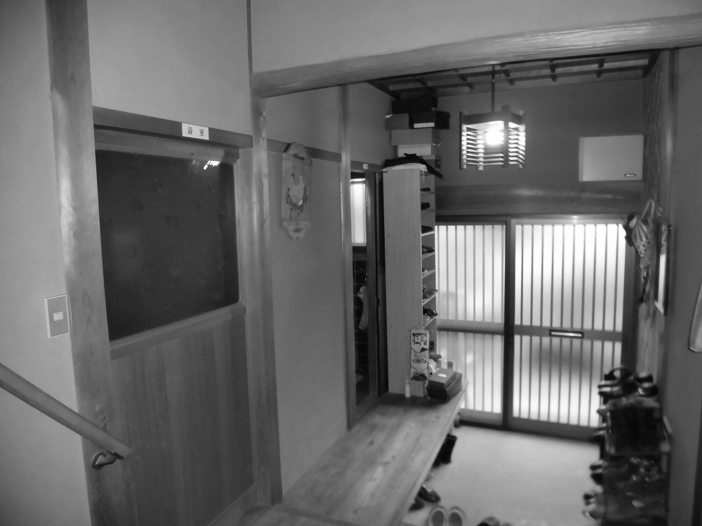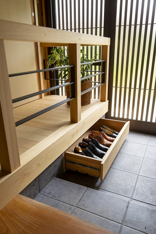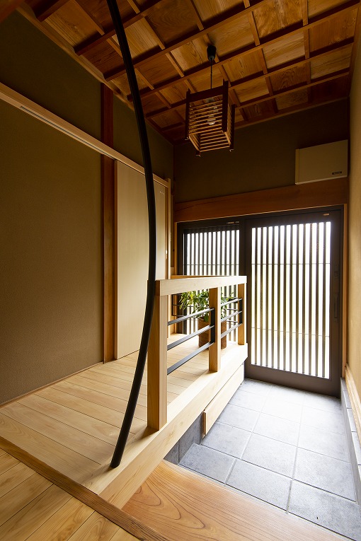 お母様のため通用口には、廊下への上り口に安全性とデザイン性を兼ねる、カーブしたアイアンの手すりを設置しました。