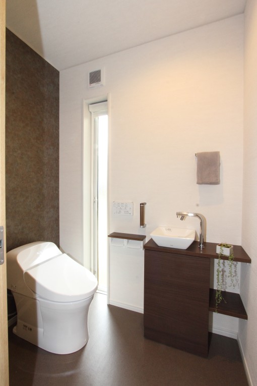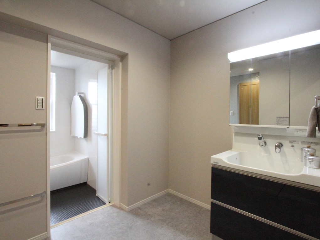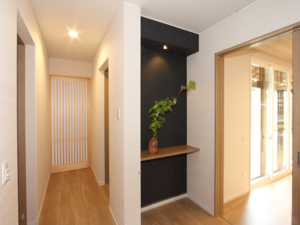 車椅子での生活が多いお母様ですが、おトイレなど身の回りのことはできることから、飾り棚の奥にあるご自身のお部屋の中に使いやすい水廻りを配置しました。しゃがむ時、立ち上がる時に使いやすいよう要所に施した手すりや、ライフスタイルの異なる世代がお互い気を使わずに生活できるよう、LDKから廊下を隔てて配置した間取りなど、お母様が落ち着いて生活できるように配慮しました。
