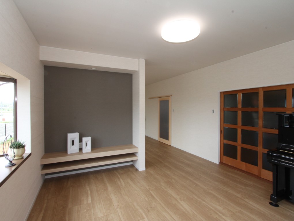 家族がくつろぐリビングとしてはもちろん、ピアノの練習をしたり、応接間として利用したり、さらには隣は洗面脱衣室なので、雨の日には室内干しの空間へと早変わり。