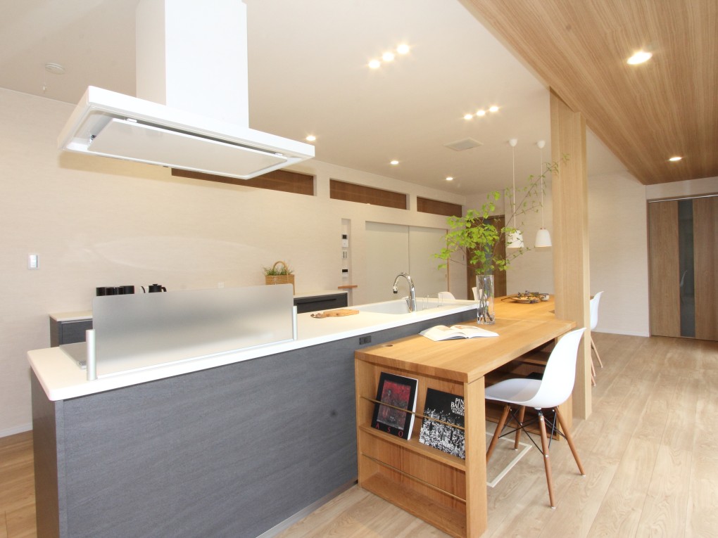 キッチンの前にはパソコン作業や読書などができるスペースをとり、家族揃って食事をとるスペースと、コーナー分け。
