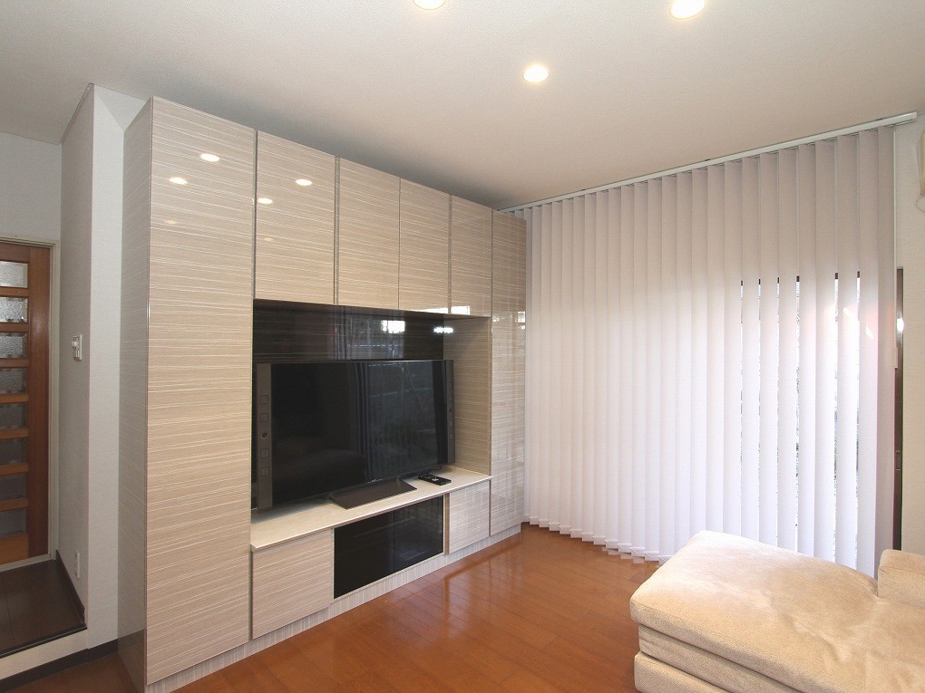 天井近くまで高さのあるTVボード付き壁面収納は、高級感のある鏡面仕上げでリビングをラグジュアリーに演出します。