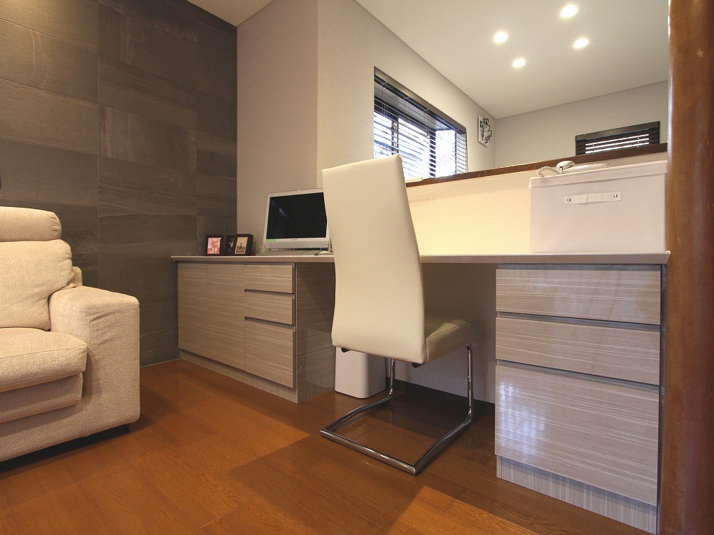 壁面収納の面材と同じ色で作ったデスク。