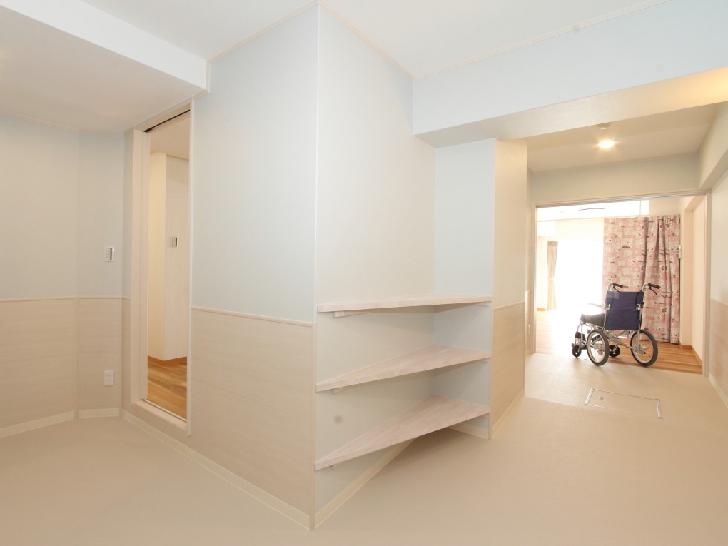 構造上移動することのできないパイプスペースとのちょっとしたスペースには棚を設置し、思い出の品やリハビリの作品を展示したり、マスクや虫よけなど、細々としたお出かけ前のグッズも置くことができます。
