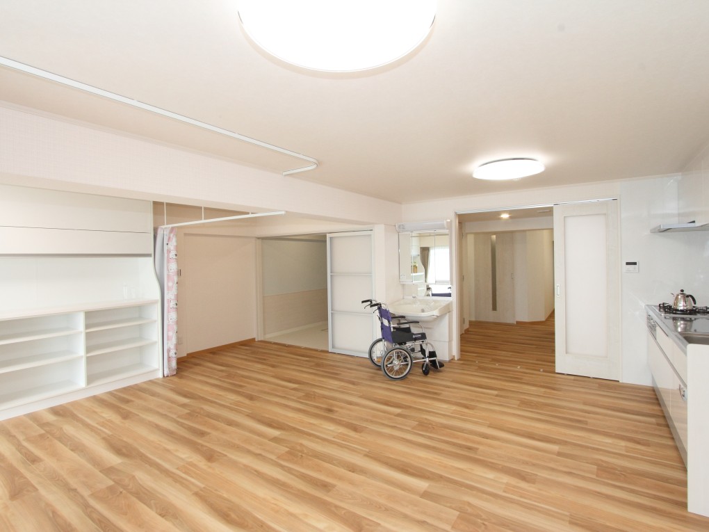 居室兼LDKは間仕切り壁を取り払い、大きな車椅子での生活にも無理のない大空間へと生まれ変わりました。大きな掃き出し窓からは、明るい陽ざしや気持ちのいい風が室内を通り、家に居ながらも四季折々の空気を楽しむことができます。
