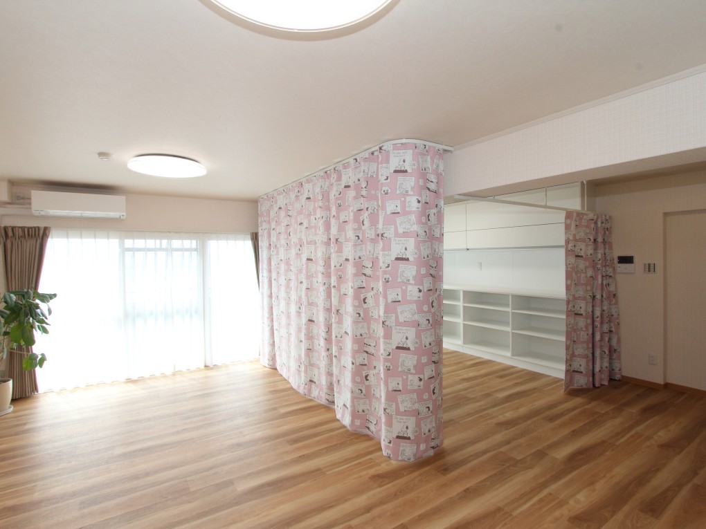 LDKとなる洋室の一部には、ベッド用の間仕切りカーテンを設置。カーテン内には介護用品などをすぐに出し入れできる大容量の収納を、使う方にあわせ造作しました。