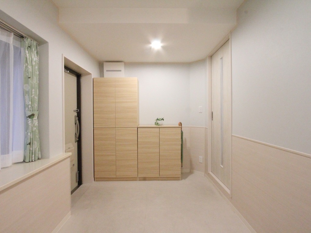 構造上移動することのできないパイプスペースとのちょっとしたスペースには棚を設置し、思い出の品やリハビリの作品を展示したり、マスクや虫よけなど、細々としたお出かけ前のグッズも置くことができます。