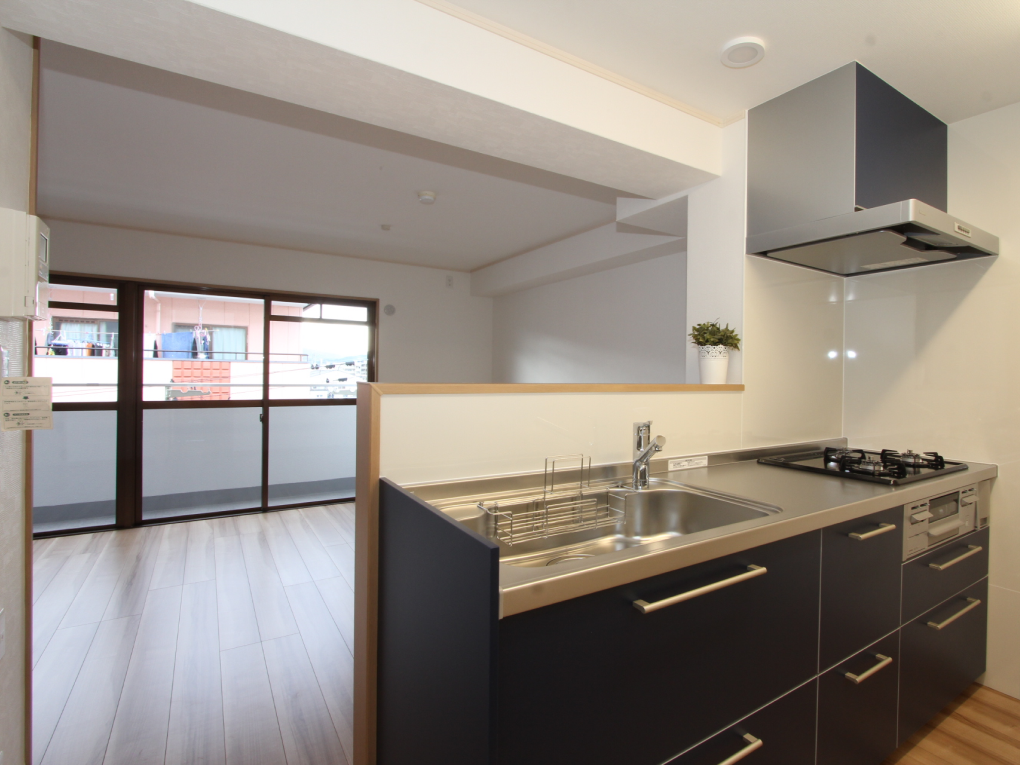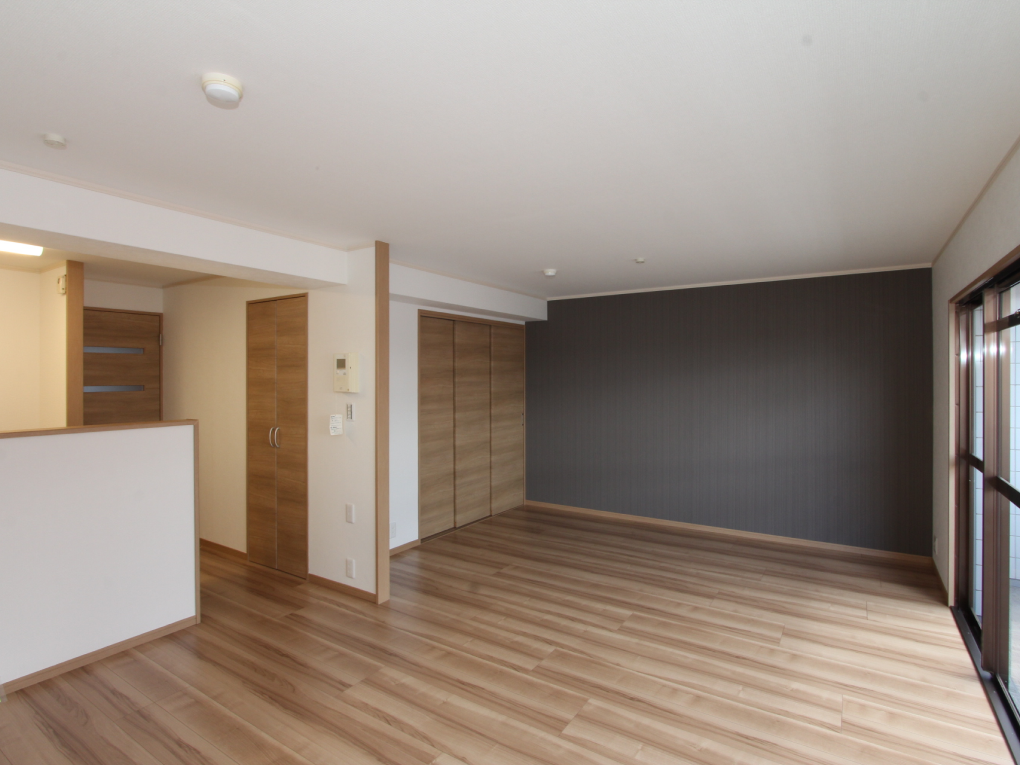 今回は、シンプルな中にも濃い差し色をアクセントに、カッコいい空間に仕上がるよう工夫しました。ダイニングキッチンに隣接していた和室を洋室にして、大きな掃き出し窓が開放的な広々としたLDKに。水廻り設備はすべて新しくし、新たに脱衣室を設けました。