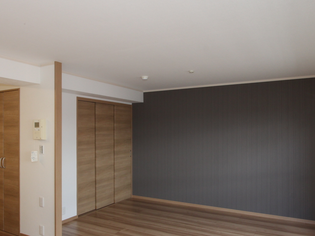 襖だった収納の開口部は、室内扉にして統一感を。 リビングの壁をアクセントクロスにしたことで、シンプルながらもお洒落で引き締まった空間を演出することができました。