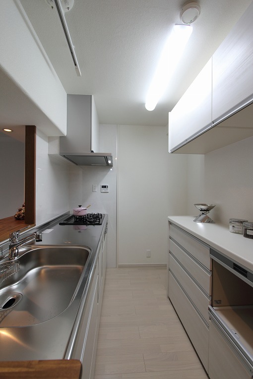 明るく優しい雰囲気のキッチン。 扉材はアイボリー色をチョイスされました。