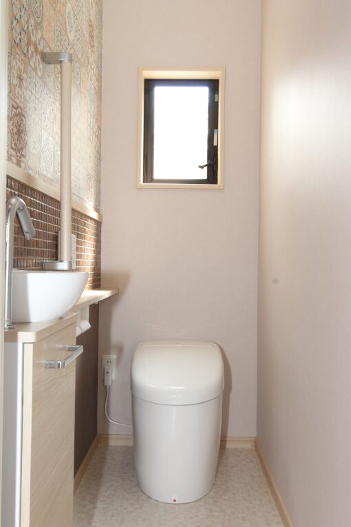 壁には洗面と色違いのタイル、上部にはアクセントクロスを貼りました。