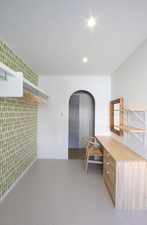 LDKとはテイストの異なるウォークインクローゼット内のインテリアは、娘さんのご希望で明るく爽やかな北欧テイストで。