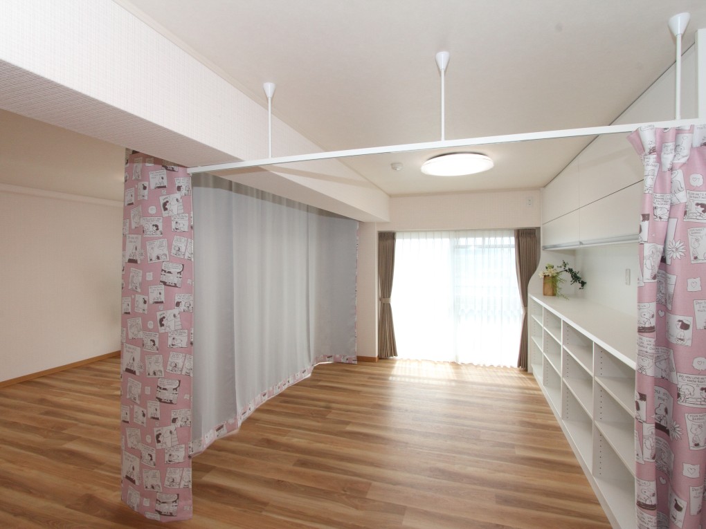 代わりに「間仕切りカーテン」を採用。カーテンを閉めればプライベートな空間になりますが、家族はカーテン越しに互いの気配を感じることができます。