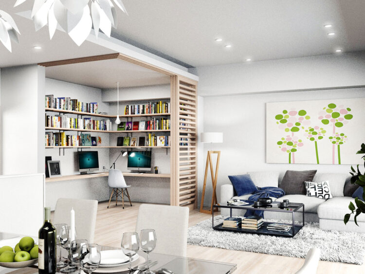 必要に応じて間仕切りを設け、独立した書斎として使うのも人気です。