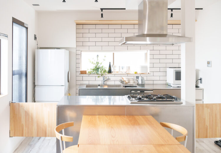 見せるキッチンで美しく配置し、キッチン天板と続きでダイニングテーブルも設置しました。