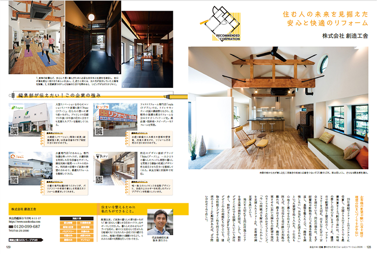 創造工舎が手掛けた古民家のリノベーションが取り上げられています。「住む人の思いに寄り添ったリモデル。頼りになるパートナー」と題してP38-P39に掲載されています。