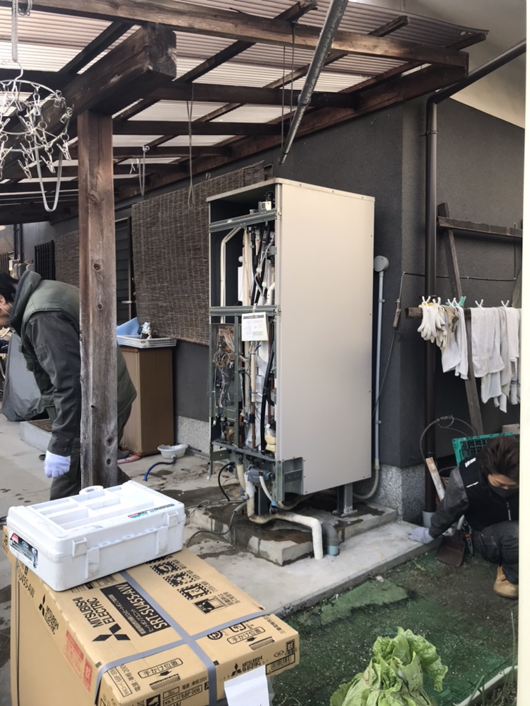 少し撤去作業が進んでおりますが、こちらが旧エコキュートです。