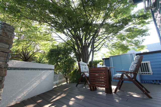 のんびりとくつろげるウッドデッキを設置し、物干しやゴミ箱などの生活スペースからは高さを変えることで緩やかに間仕切っています。