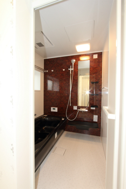 お風呂はTOTOのサザナ。洗面化粧台には、爽やかなクロスを。チェック×花柄という2種類ですが、同系色ですので清潔感のある仕上がりになりました。トイレも、天井と背面のクロスで遊び心を。設備は白×茶色でシックに揃えましたが、クロスで軽さが演出されています。