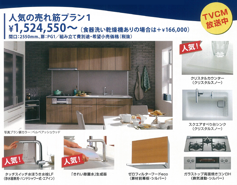 透明感あふれる質感で人気の“クリスタルカウンター”と、人気の最新アイテム“「きれい除菌水」生水器”と“タッチスィッチ水ほうき水栓LF”を搭載した、売れ筋のキッチンプランです。