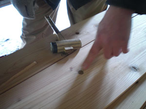 木の節が抜けている所は、丸く加工した木材をはめ込み加工していきます。