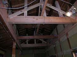 平屋ですが棟高さが4.8mほどあって、大きな空間としてゆったりとした気持ちのよい空間としています。但し、解体してみると屋根の荷重を受ける小屋組(梁)が2間(3.6m)と離れていましたので、このままでは、いざ地震で大きな揺れを受けたら、壁面の途中での補強繋ぎが不足のため、折れてしまう可能性があります。